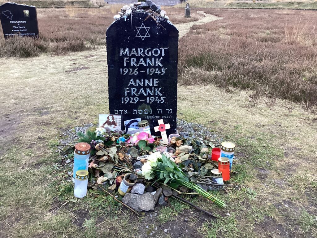 Danach ging es weiter mit dem Bus bis zur Gedenkstätte Bergen-Belsen. Während der Führung durch die Gedenkstätte sind wir an Massengräbern und an vielen Gedenksteinen und -tafeln vorbeigekommen. Am Gedenkstein des jüdischen Mädchens Anne Frank, das kurz vor Ende des Zweiten Weltkriegs im Konzentrationslager von Bergen-Belsen umgekommen war, haben wir einen Strauß mit weißen Rosen niedergelegt. Anne Frank wurde durch ihr Tagebuch, dass sie während der Zeit des Versteckens vor den Nationalsozialisten geschrieben hatte, weltweit bekannt. Ihr Tagebuch ist zu einem der wichtigsten Zeugnisse des Holocausts geworden.
