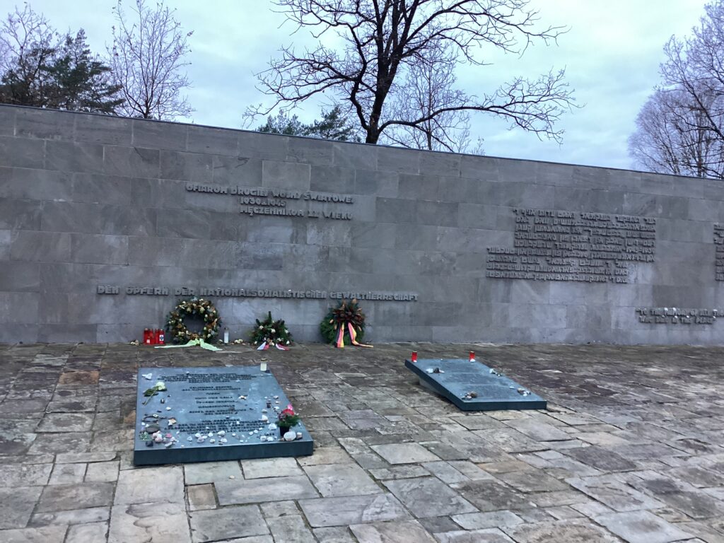 Auf unserem Weg sind wir an weiteren Zeichen des Gedenkens vorbeigekommen, an einem großen Holzkreuz zum Gedenken an die ermordeten polnischen Menschen, an einem Obelisken und an einer Inschriftenwand gegen das Vergessen. Im Haus der Stille, einem begehbaren Mahnmal, kann man der Opfer des Nationalsozialismus gedenken und kleine Botschaften und Kerzen hinterlassen. Zum Schluss hatten wir noch etwas Zeit, uns im Dokumentationszentrum der Gedenkstätte weiter zu informieren. Dort war u. a. eine zerstörte und wiederaufgebaute Frauenstatue zu sehen, die an die sowjetischen Opfer der NS-Zeit erinnern soll.